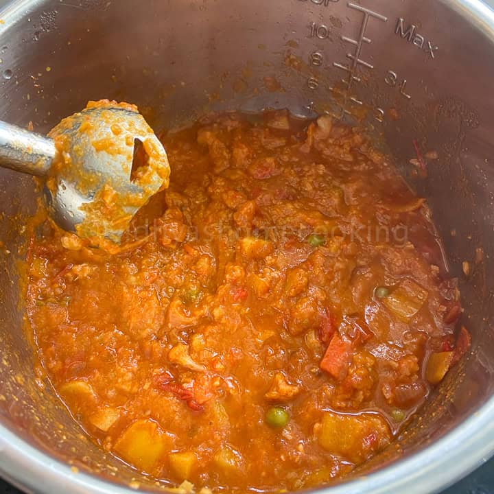 Learn how to make the bhaji(mixed-vegetable curry) for the famous Indian Street Food, Pav Bhaji, in an electric pressure cooker/Instant Pot and stovetop pressure cooker.