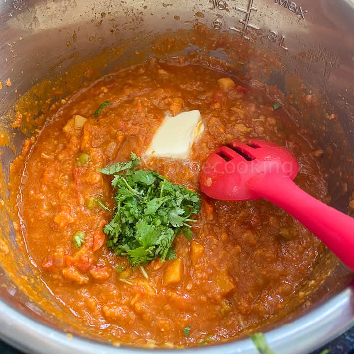 - Mix well and set the Instant Pot back in saute mode. Let it cook for two to three minutes. Then add the chopped cilantro and more butter. Mix well and turn off the Instant Pot.