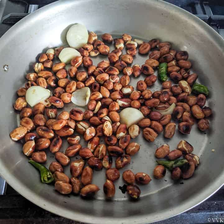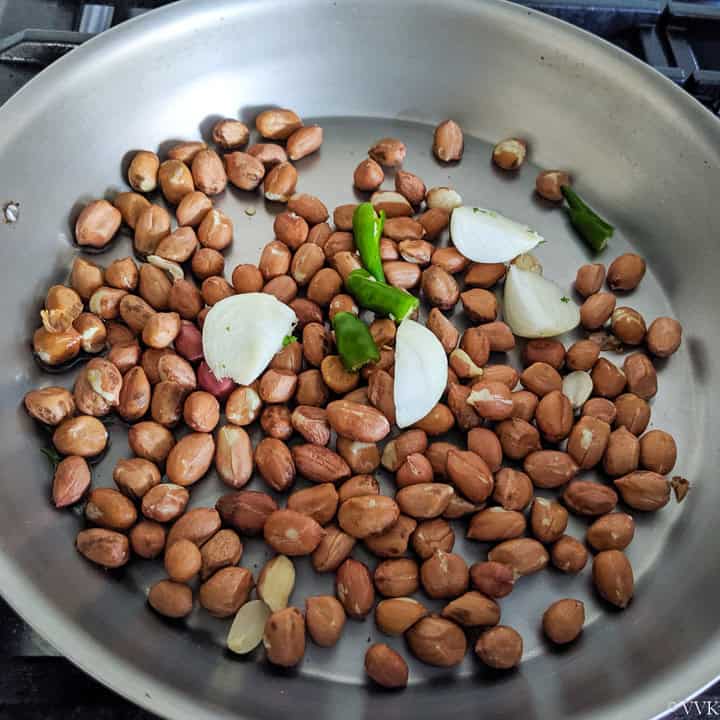Well, these days, you find roasted peanuts in the store. You can very well use that for this recipe, but make sure to buy the unsalted ones. Buying roasted peanuts saves a few minutes, but it is not mandatory to buy roasted peanuts. I went with raw or unroasted peanuts for this chutney. Even if you buy roasted ones, I would recommend roasting them for at least a minute to bring that crispiness