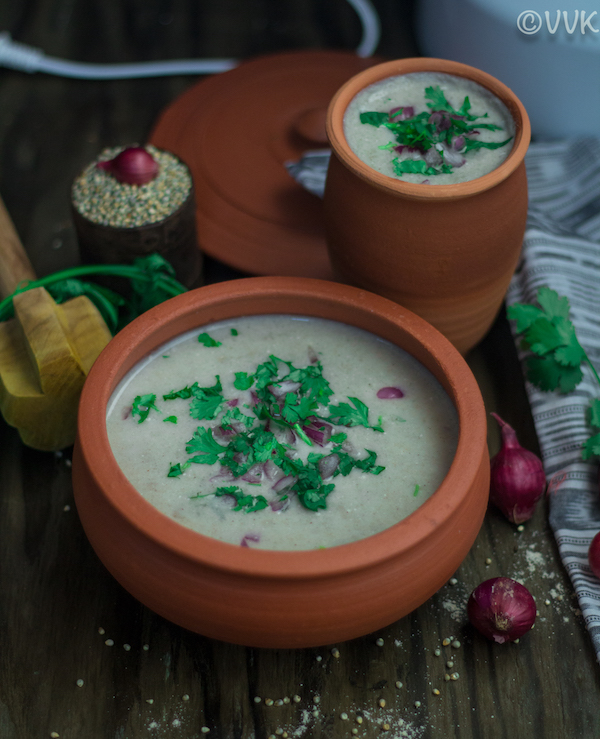 Koozh or gruel is thick consistency porridge. Kambu Koozh is a very common breakfast in rural parts of Tamil Nadu especially during summer months. Bajra combined with buttermilk is an excellent coolant and keeps your body hydrated in hot summer months. The probiotics in the buttermilk clean the unhealthy bacteria, in turn, helping with our digestion. It also helps with acidity troubles. Try this gruel instead of smoothies, and I am sure you will love it.