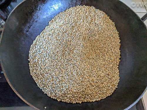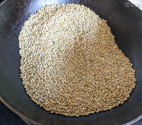 - Take 2 to 3 cups of pearl millet and dry roast on a pan without adding any oil.