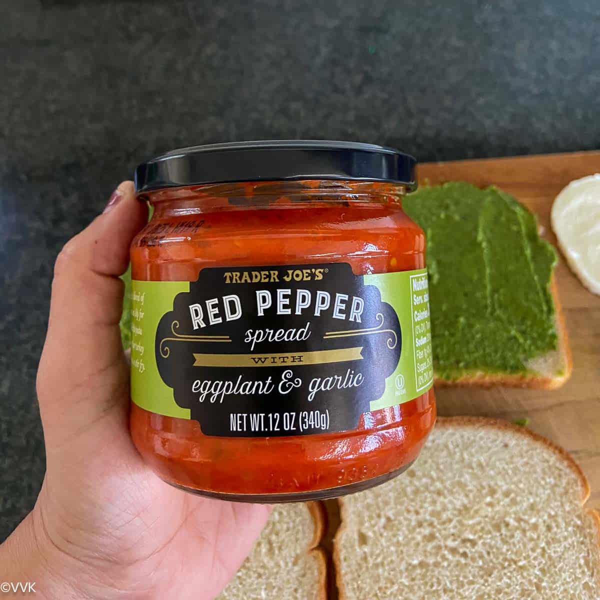 Red pepper spread – I also used TJ’s red pepper spread with eggplant and garlic, which adds a nice flavor and color to this sandwich. It’s optional. You can use muhammara or other spreads that you have in hand too.