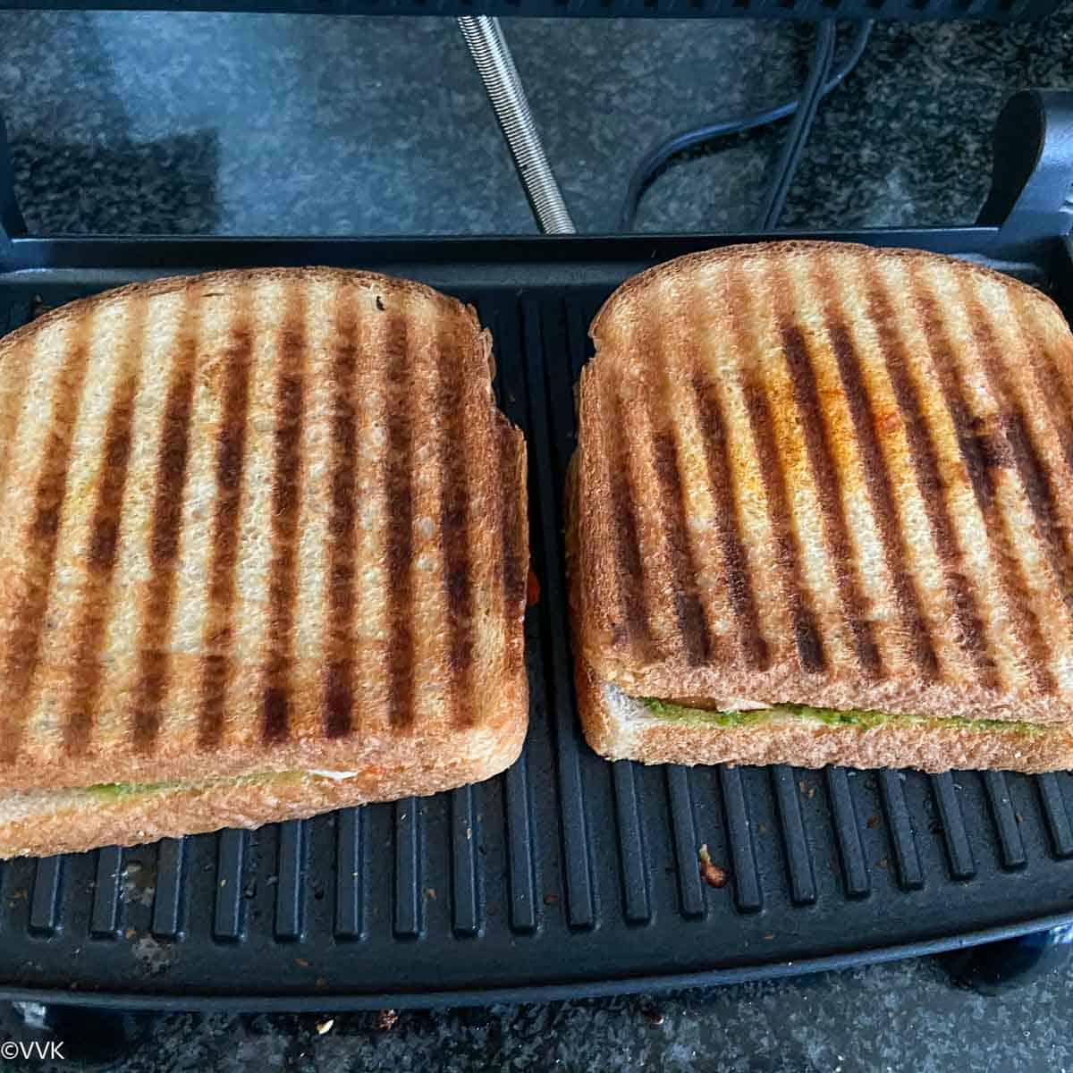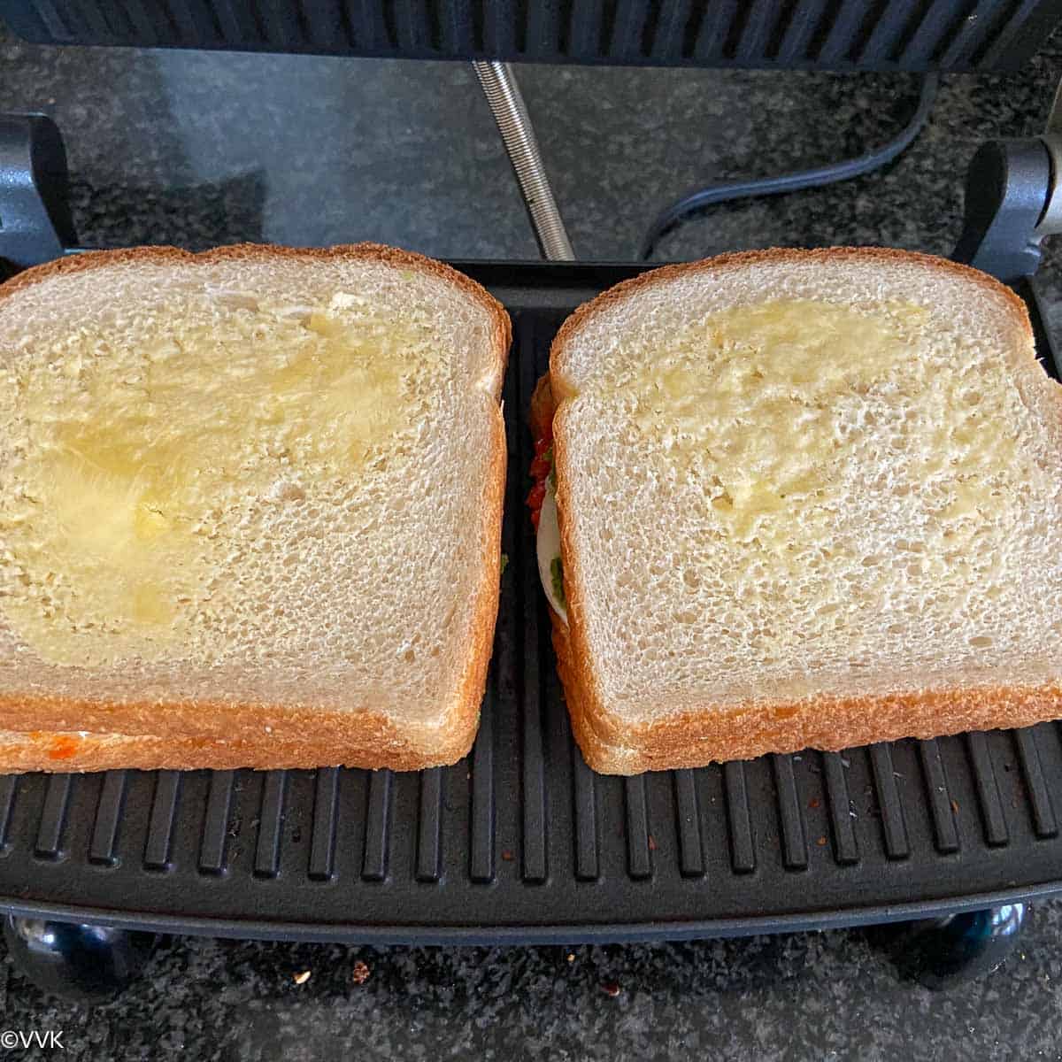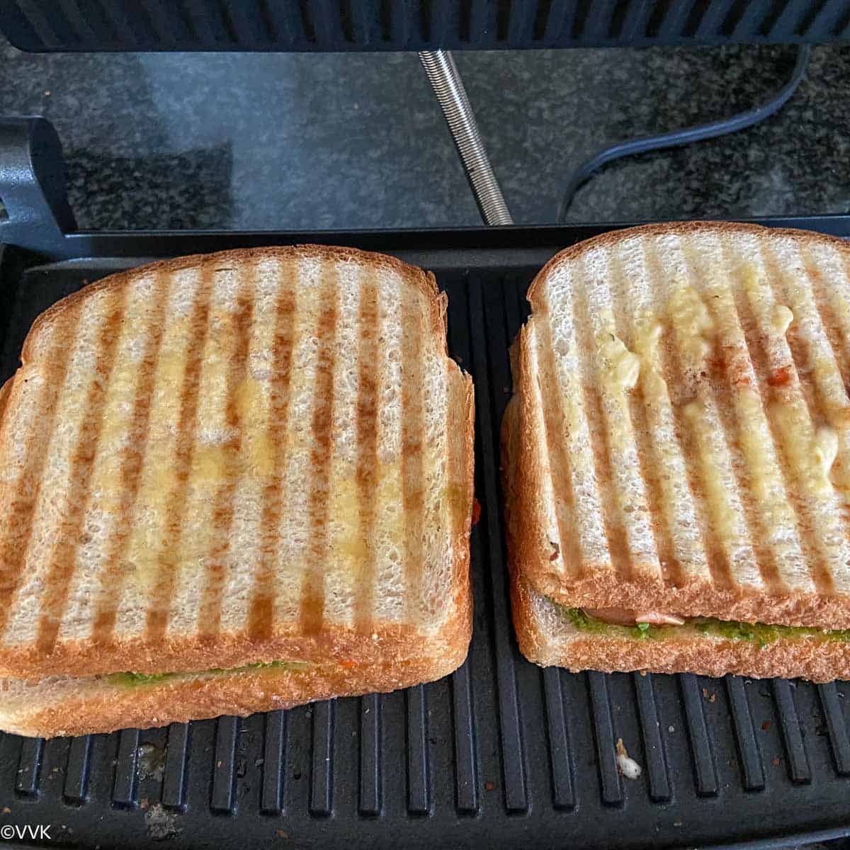 - You don’t need a sandwich maker or panini press to make this sandwich. You can make it on a dosa pan too. Heat the pan, place the sandwich, and spread the butter when it is hot. Cook on one side for 60 to 90 seconds, flip again, and cook until the cheese melts.