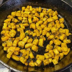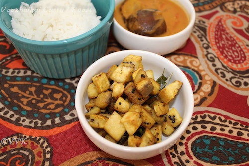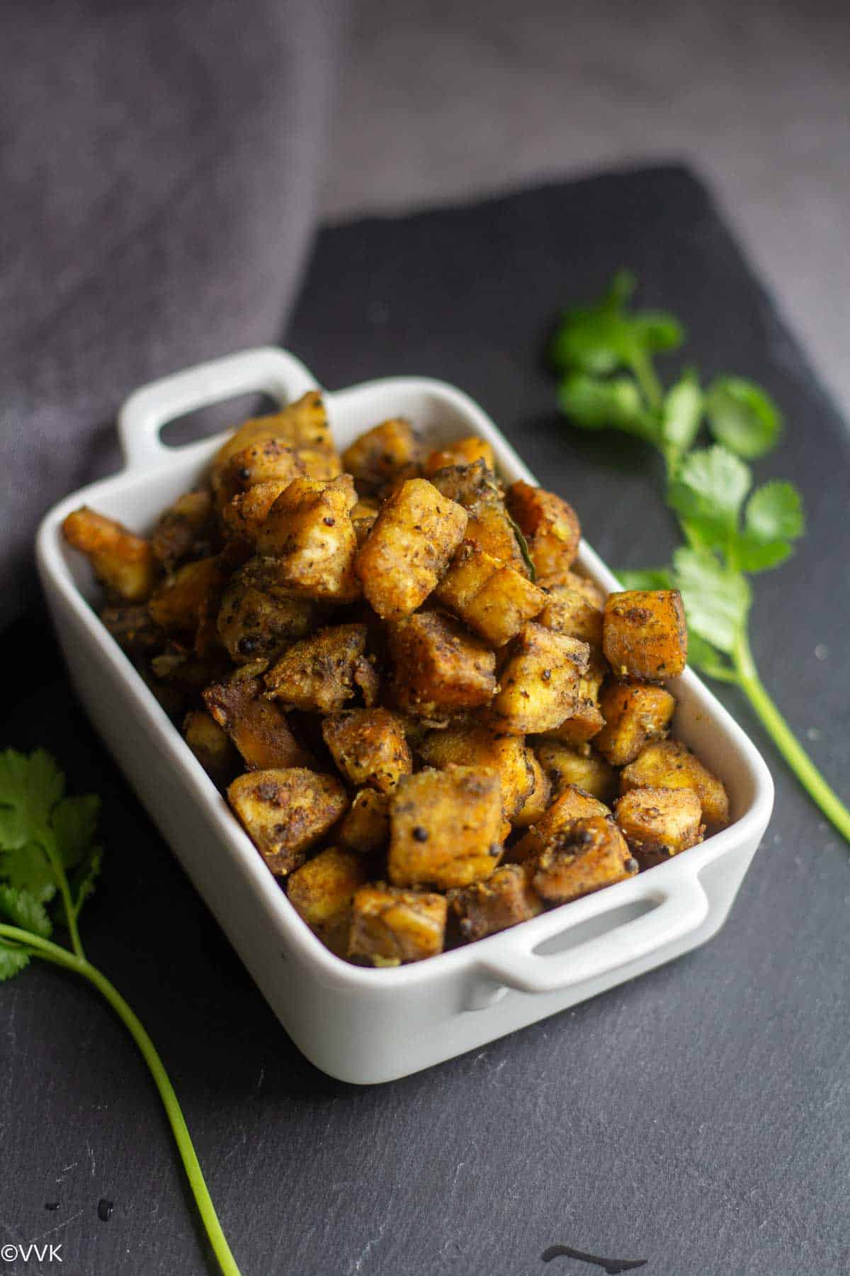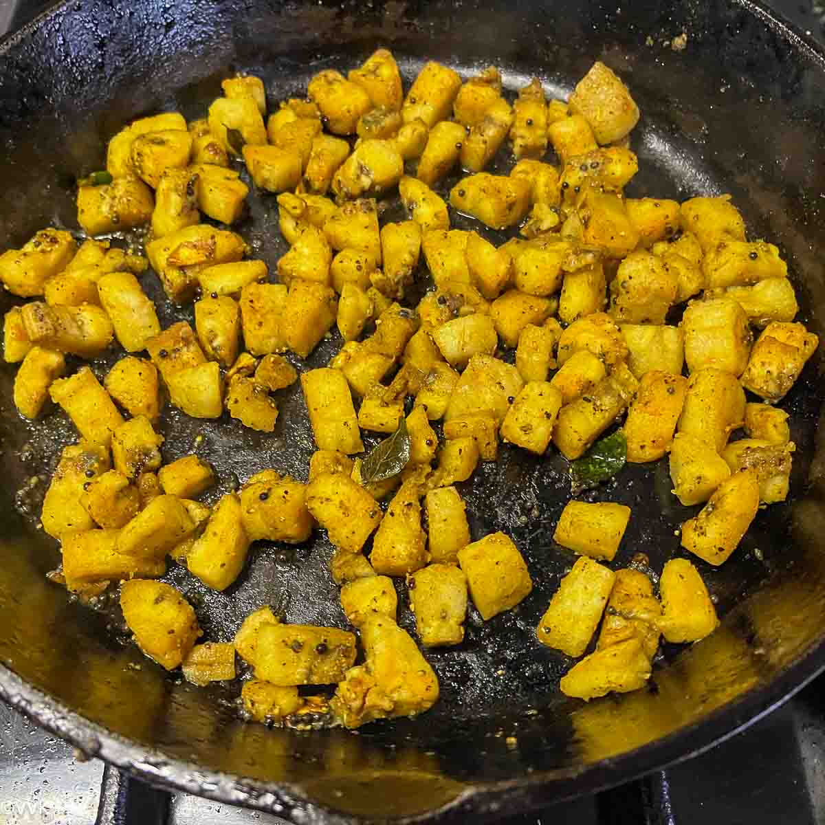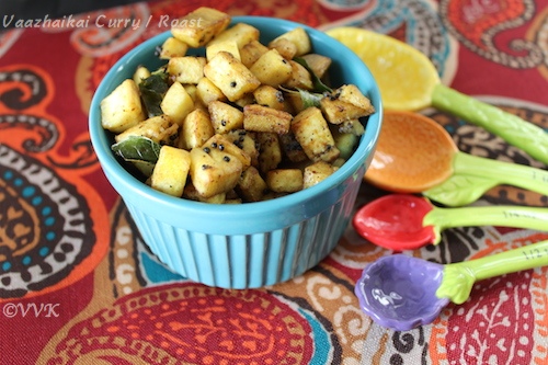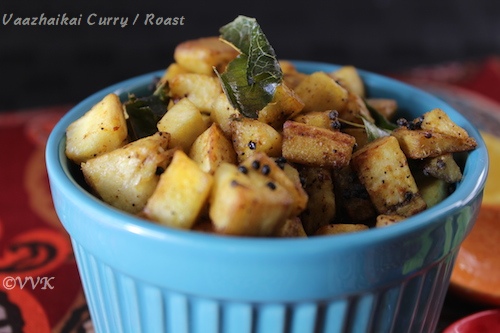 - Reduce the heat to medium–low and roast for 5 to 7 minutes until a golden crust forms. Enjoy the vazhakkai varuval with rice and any curry of your choice.