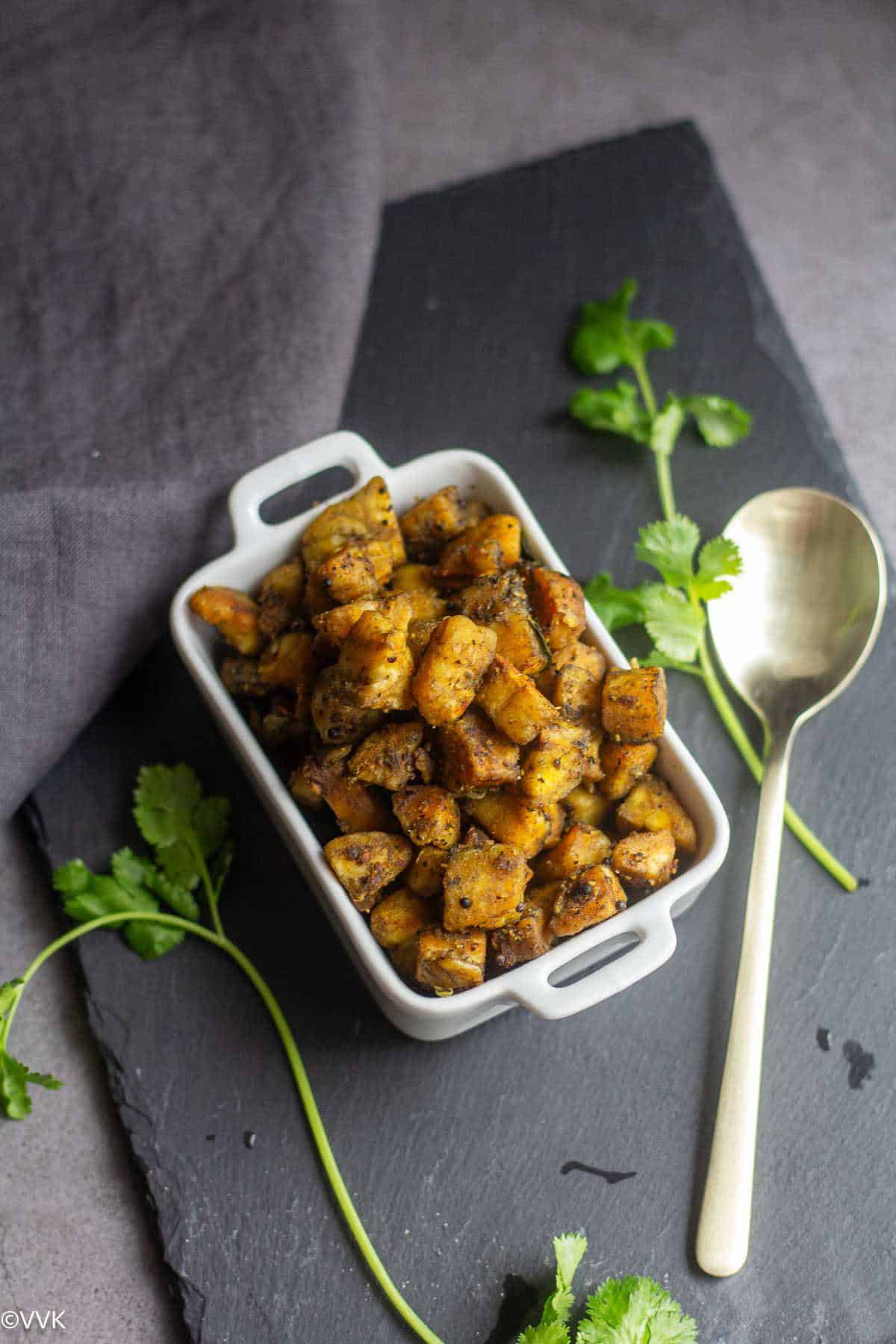 A simple yet flavorful roasted plantain (raw banana) recipe infused with the bold flavors of pepper and garlic, made with minimal oil. Learn how to prepare this delicious vazhakkai milagu varuval with step-by-step pictures.