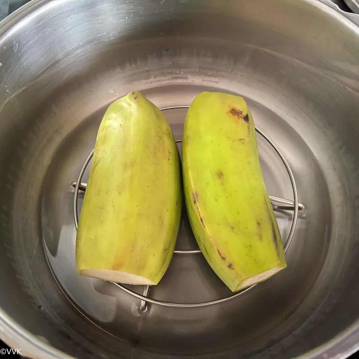 - Trim the edges of the raw bananas. Steam them using your preferred method. I used a stovetop pressure cooker—added 1 cup of water, placed a trivet, and set the trimmed bananas on top. Pressure cook for two whistles. For Instant Pot, steam for 5 minutes and release the pressure after 10 minutes.