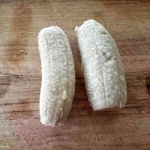 - Let the cooked raw bananas cool slightly, then remove the skin—it should peel off easily.