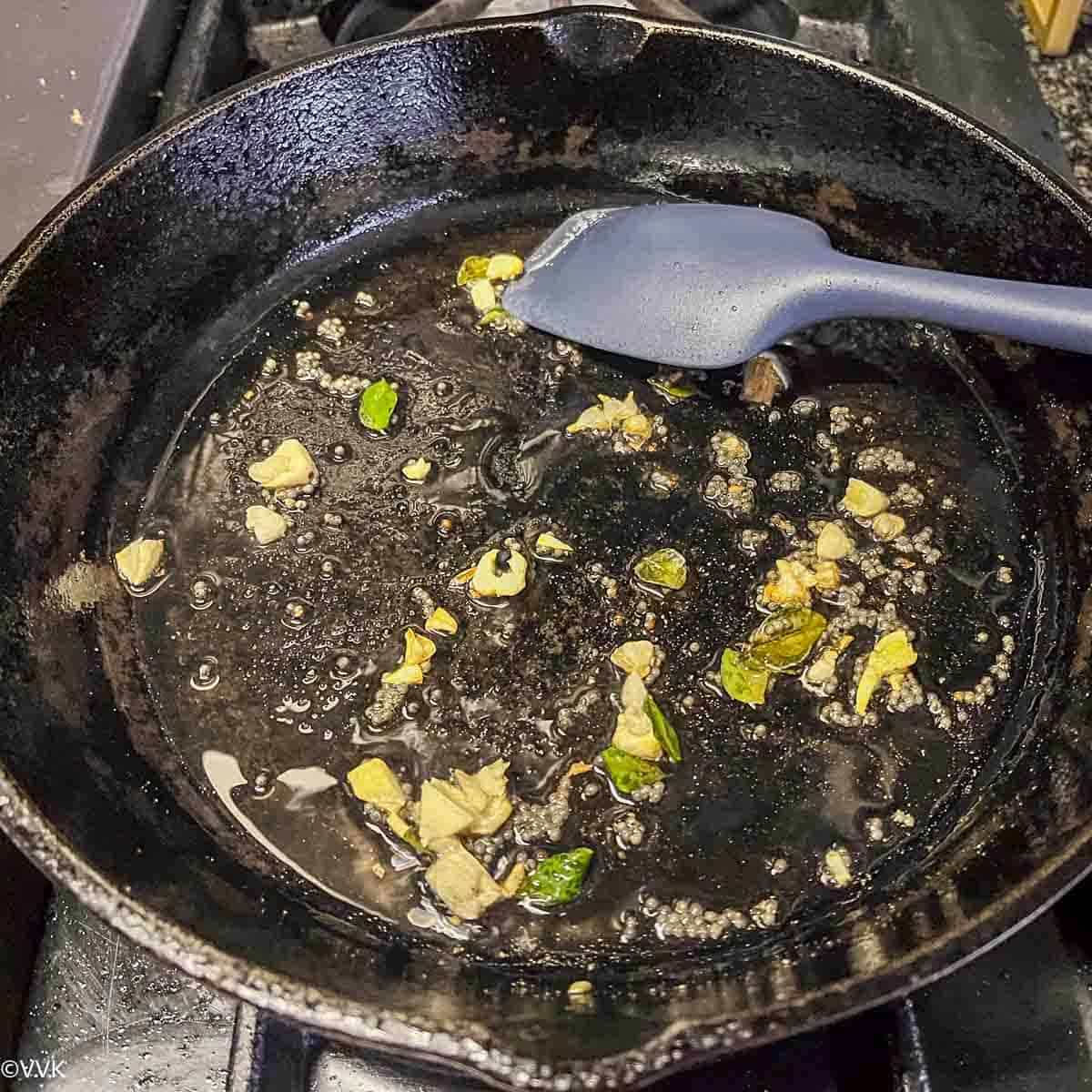 - Heat a pan or kadai and add coconut oil. Once the oil is hot, add mustard seeds, asafoetida, finely chopped garlic, and curry leaves.