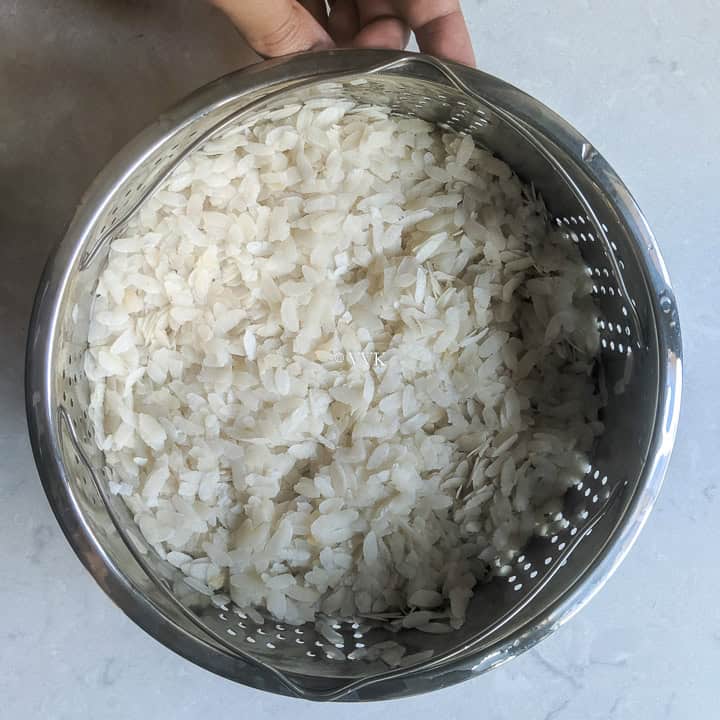 - Wash and prep the poha – Add the poha in a strainer or colander and rinse it thoroughly atleast twice. Drain the water, drizzle some water (¼ to ⅓ cup approx) and let it sit for 10 to 15 minutes. Meanwhile, you can saute the onion and start with the poha preparation.