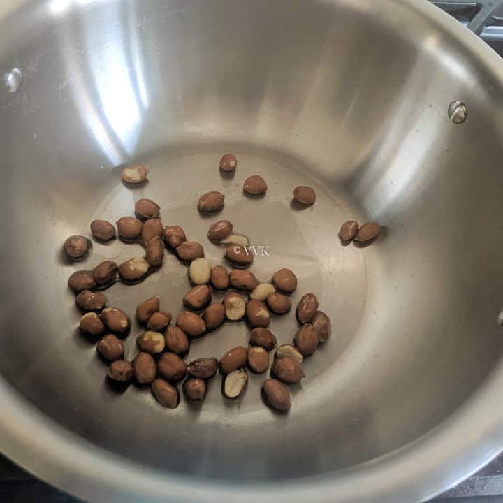 - Heat a saucepan or kadai and heat the oil. When the oil is hot, add the peanuts and roast until it turns brown and crunchy. Remove the peanuts from the pan and set them aside.