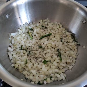 - In the same pan, add the mustard seeds and the cumin seeds. Let the mustard seeds splutter, then add the slit green chilies, curry leaves, and ginger. Saute for 30 to 45 seconds and add the finely chopped onion.