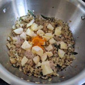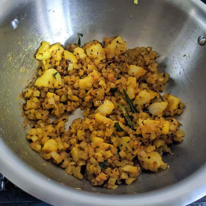 - Saute the onion until it turns soft and translucent, and then add the boiled potatoes, salt, and turmeric powder.