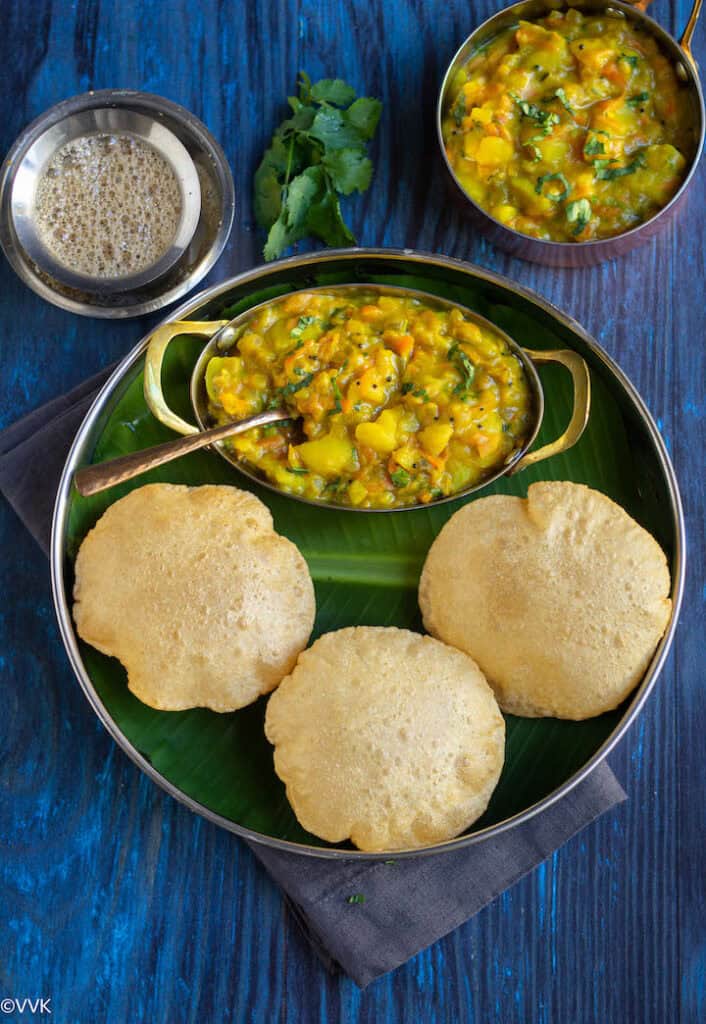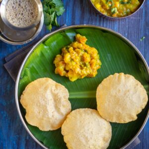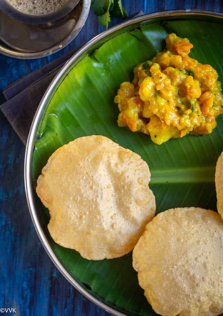 Poori or puri is a deep-fried unleavened flatbread made with wheat flour that’s quite popular across the Indian subcontinent. While it’s a typical breakfast dish in South India, in my opinion, you can relish it for any meal. You can find poori as part of Indian thali/meal plates as well.