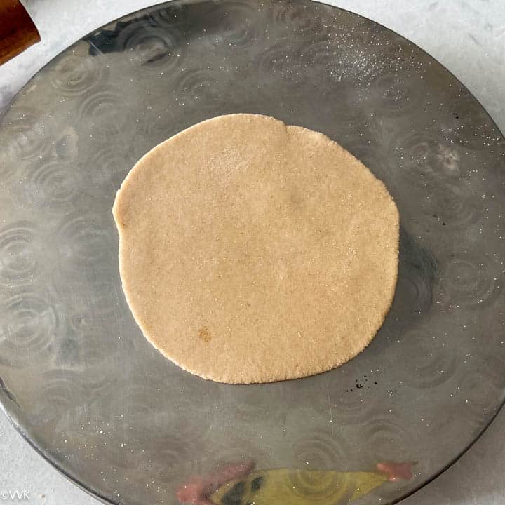 - On a dusted surface, take one ball and roll it out into a small circle, 3 to 4 inches in diameter. Do not roll it too thin or too thick.