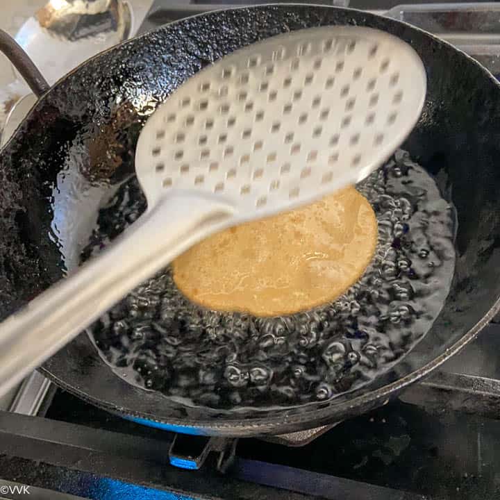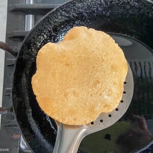 - Let it sizzle for few seconds, and slowly the poori will puff up. You can gently press the poori with the back of the slotted spoon so that it puffs up evenly.