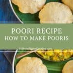 - For puffy poori: While frying the poori, gently press the poori with the slotted spoon’s back, and it helps the poori to puff. You can see that on my IG videos. Also, try not to stack the pooris after frying.