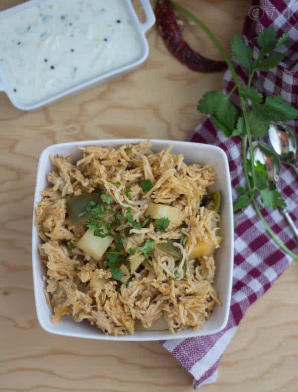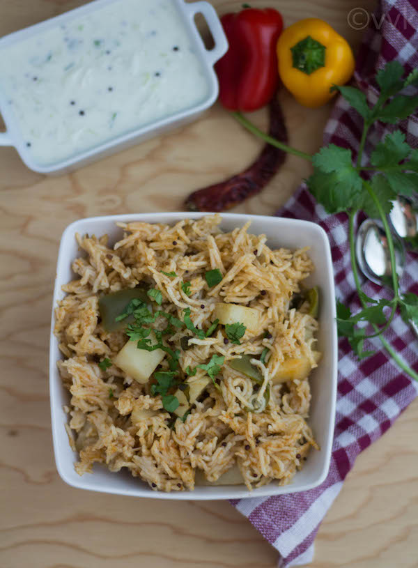 Enjoy your potato-capsicum rice with raita, papad, or curry!