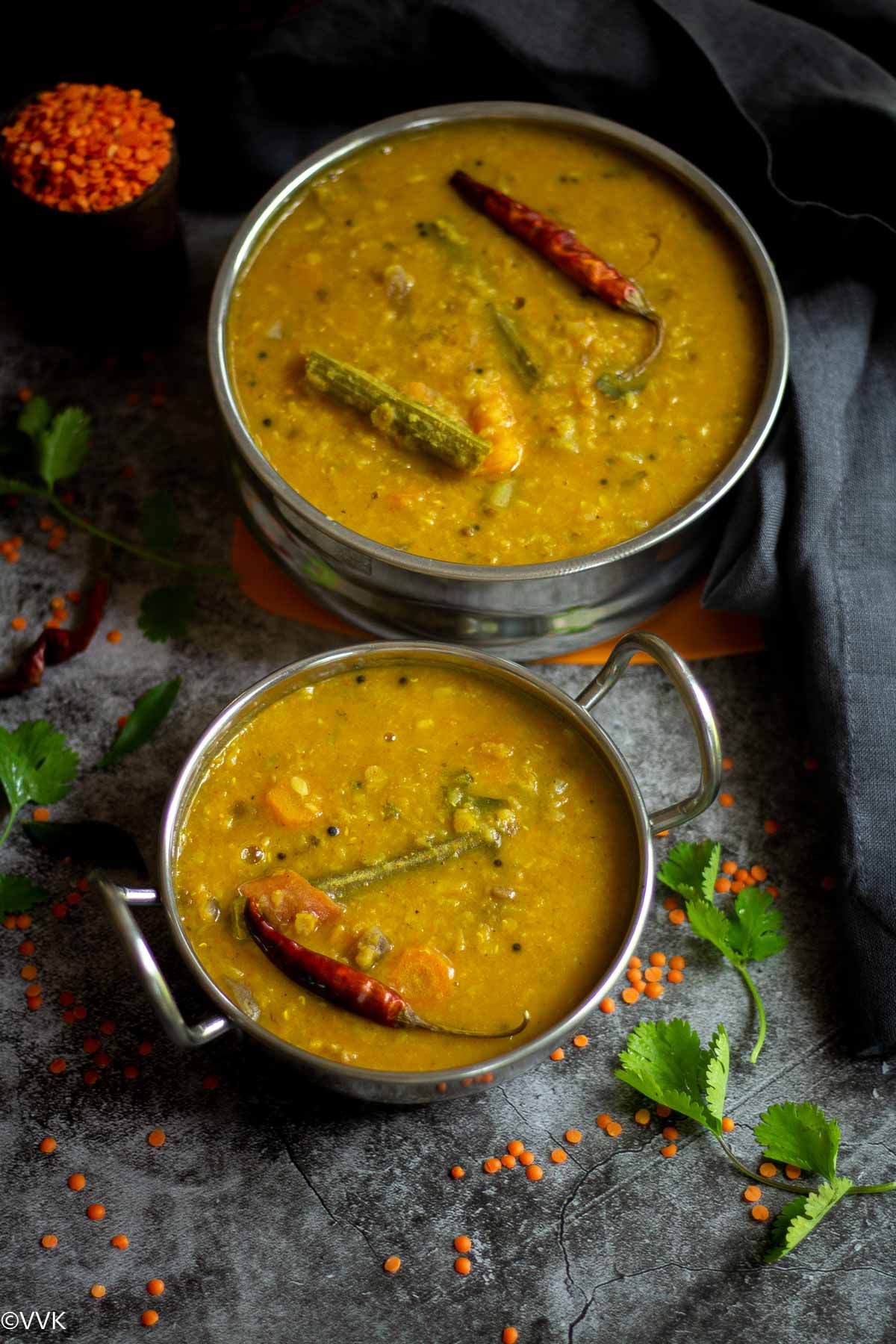 Quick and easy one-pot pressure cooker sambar recipe with mixed vegetables and masoor dal! Learn how to prepare this sambar and freeze the same. Yes, it’s a freezer-friendly sambar recipe.