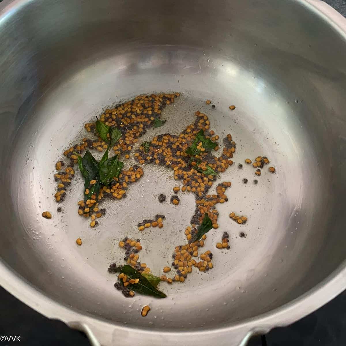 - Heat the pressure cooker and add the oil. When the oil is hot, add the mustard seeds, fenugreek seeds, curry leaves, and asafoetida, and let the mustard seeds splutter.
