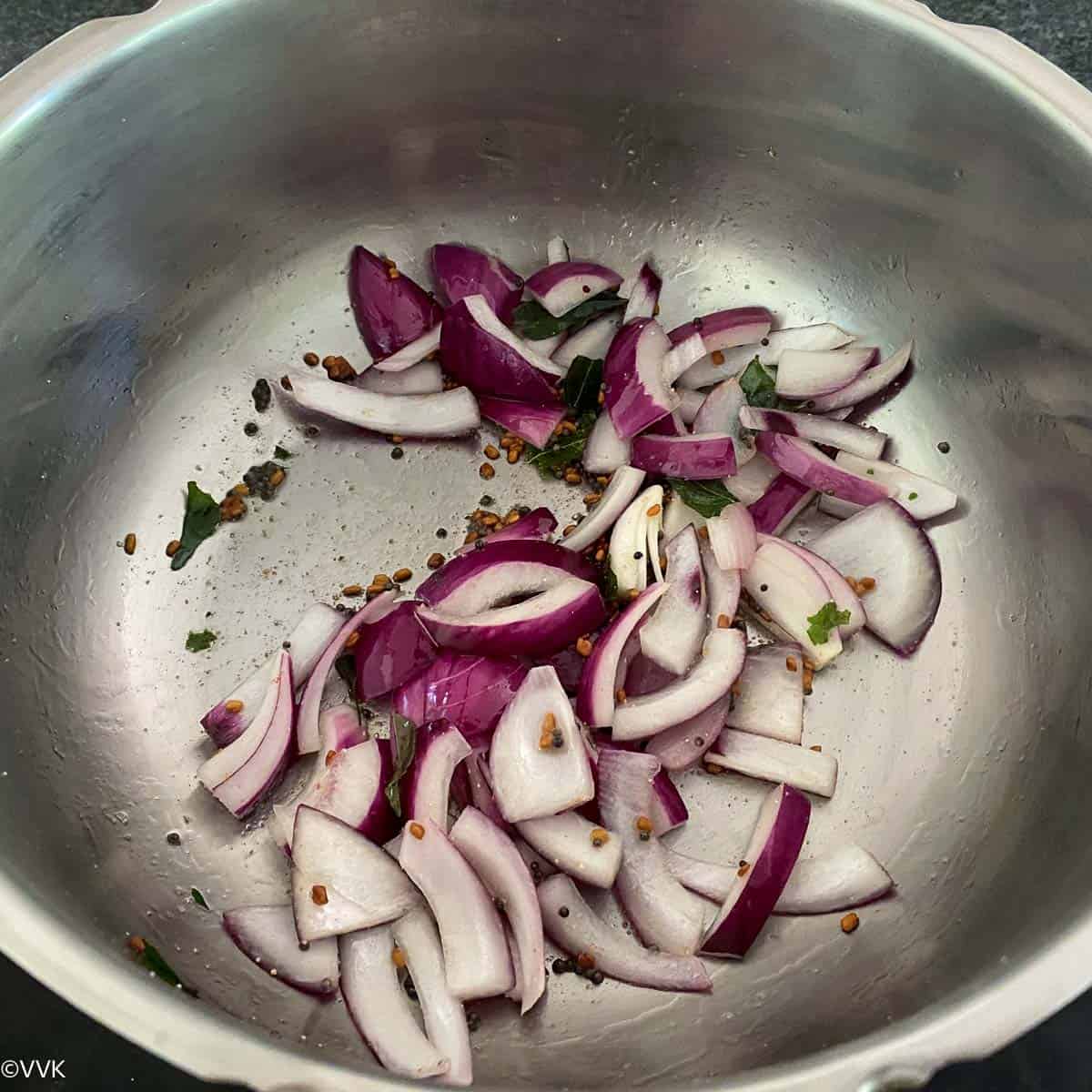 For this masoor dal sambar, I went with mixed vegetables. But you can add just one vegetable of your choices like radish, zucchini or drumstick, or brinjal along with onion and tomato. Two to three cups of vegetables would work.