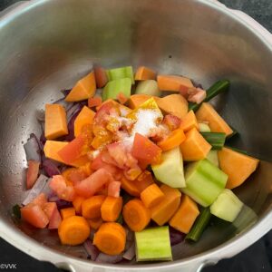 - Add all the veggies – tomatoes, zucchini, sweet potatoes, drumsticks, and carrots. Add salt and turmeric powder.