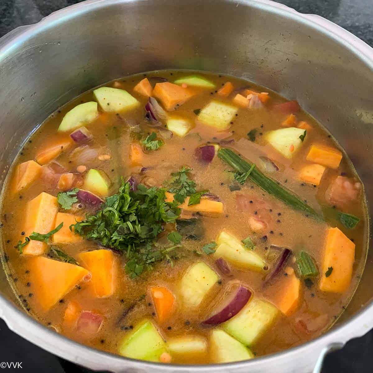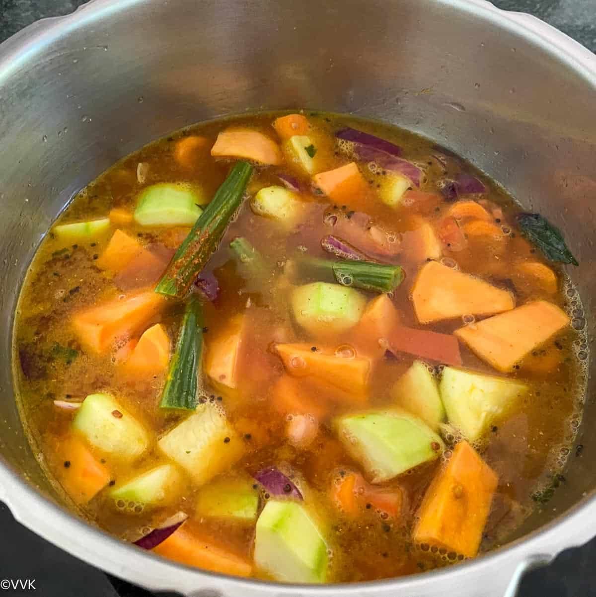 - Mix all the veggies and add the tamarind water and sambar powder mixed with ½ cup of water. We mix the sambar powder with water to avoid the lumps. Reduce the heat to low. Add one more cup of water, jaggery, salt, and mix.