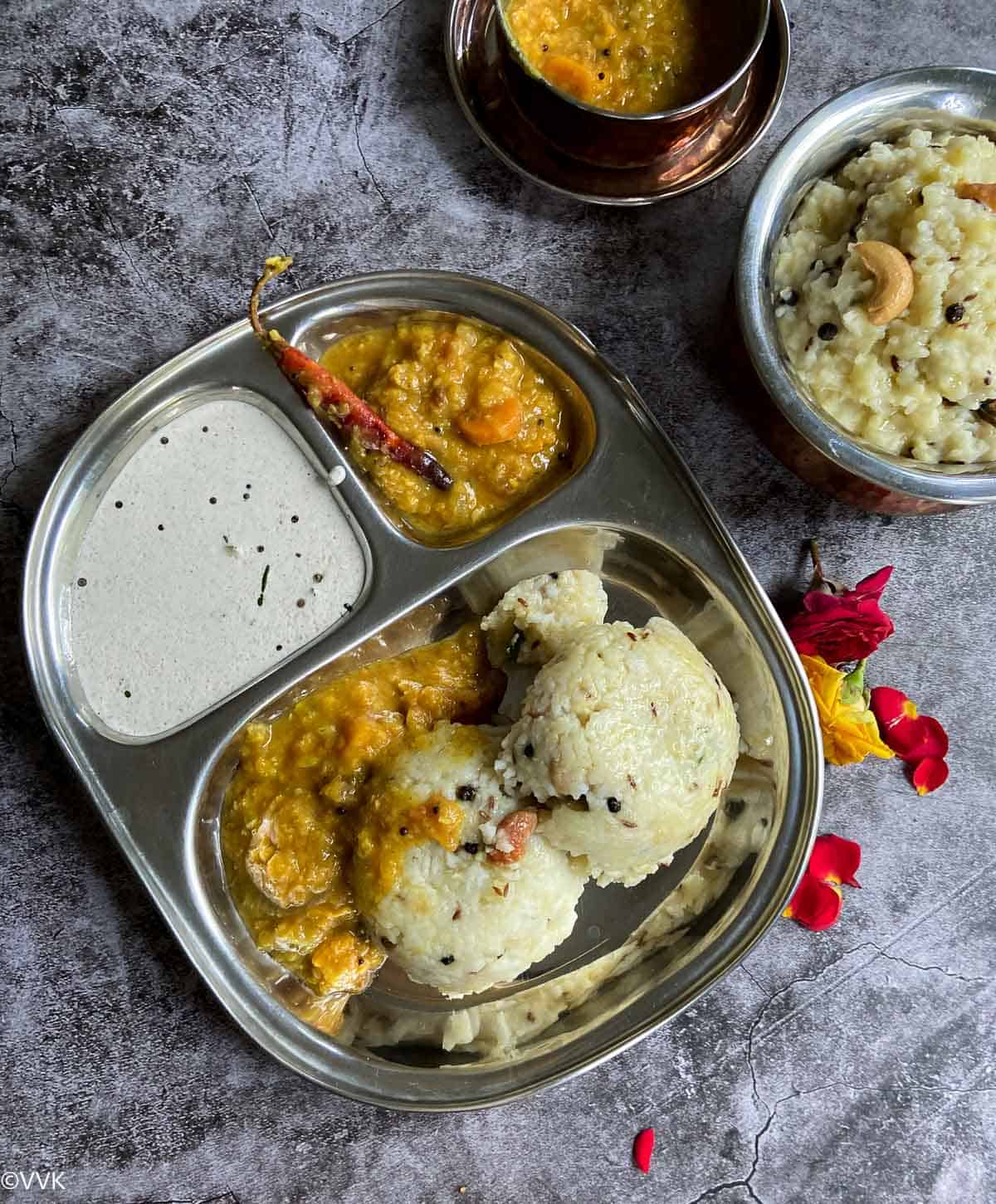 This sambar is vegan and nut-free. Use gluten-free asafoetida for a gluten-free version. As I mentioned before, you can serve this sambar with idli, dosa, pongal, and upma. It also goes well with rice. I served this sambar with pongal and chutney this time.