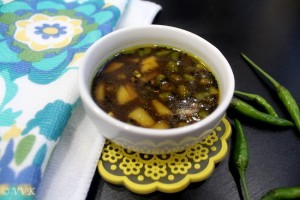Puli milagai as we say in Tamil which is Green chili in tamarind sauce is quite popular in Tamil Nadu. And puli inji or inji puli or ginger with the hint of green chili in tamarind sauce is quite popular in Kerala. Puli inji is part of the onam feast menu too. I had mentioned this on my blog before that my mom’s maternal relatives lived in Kerala. Her food is the amalgamation of Kerala, Karnataka and Tamil cuisine. (We are Kannadigas born and bought up in Tamilnadu). So is her cooking. :-) This puli milagai is a perfect example of one such amalgamation.
