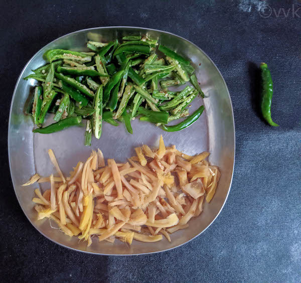 For this recipe, all you need to do is chop ginger and green chili and simmer in tamarind sauce along with jaggery and salt. If you want it like gravy for rice or dosa, add more water. If you want it like a pickle, reduce the water quantity. But my mom simmers it for a long time, so it thickens and makes it more like a gojju/thick stew. If you are looking for some other gojju recipes, then check my wild lemon gojju and also tomato gojju recipes.