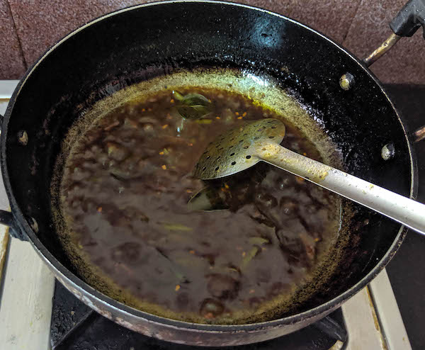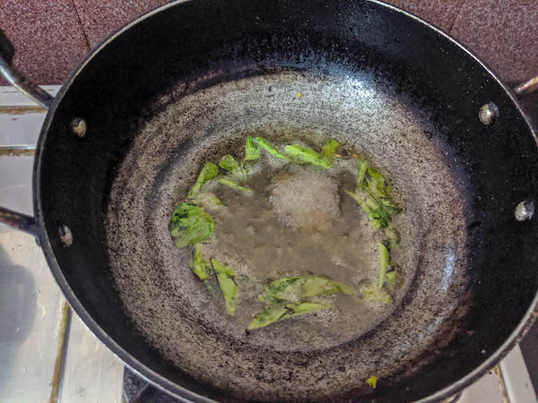 - Heat a kadai or heavy-bottom vessel and add the sesame oil. When the oil is hot, add the mustard seeds, fenugreek seeds, curry leaves, and asafetida. Allow the mustard seeds to splutter.