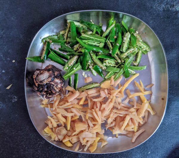 - Here is the picture of the three main ingredients, green chili, ginger, and tamarind.