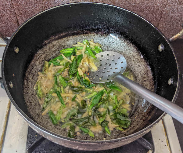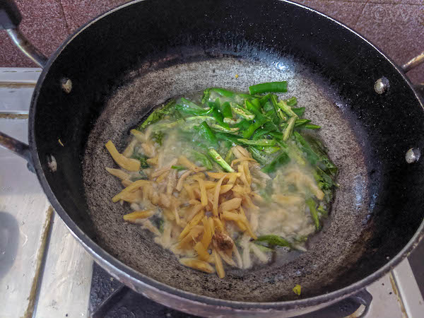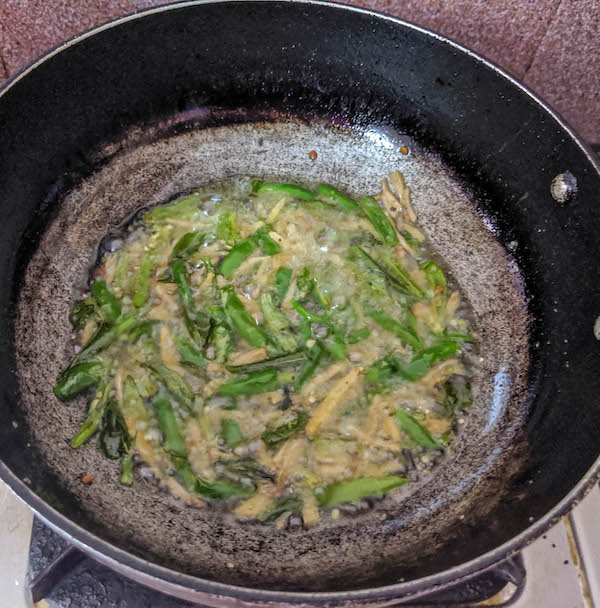- Then add the chopped ginger and green chili.