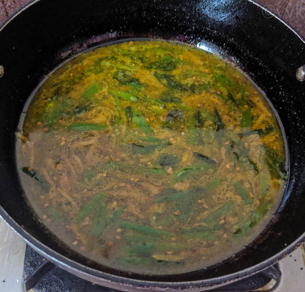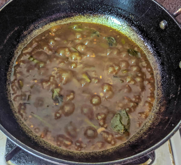 - Then add the tamarind juice, followed by turmeric powder and salt.