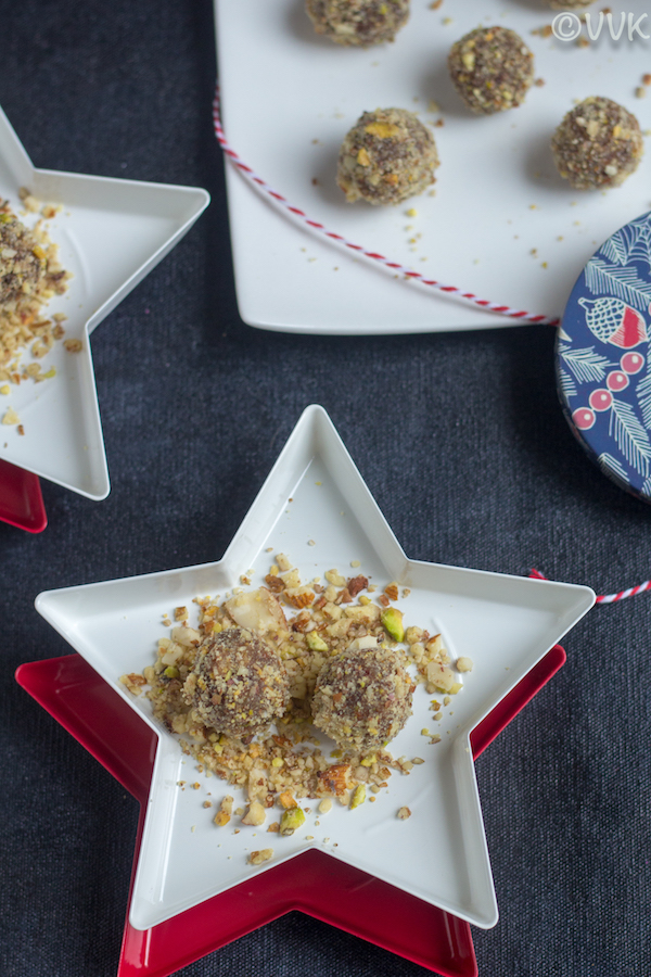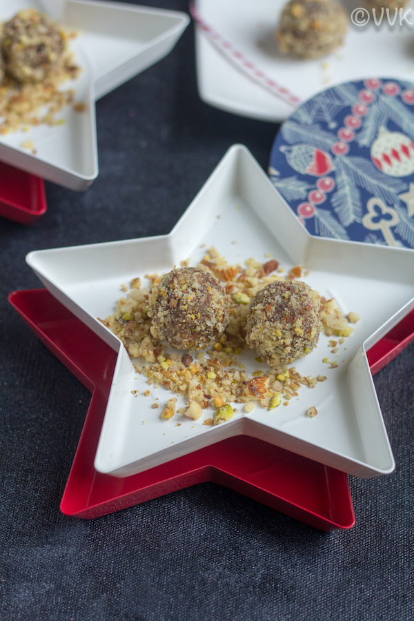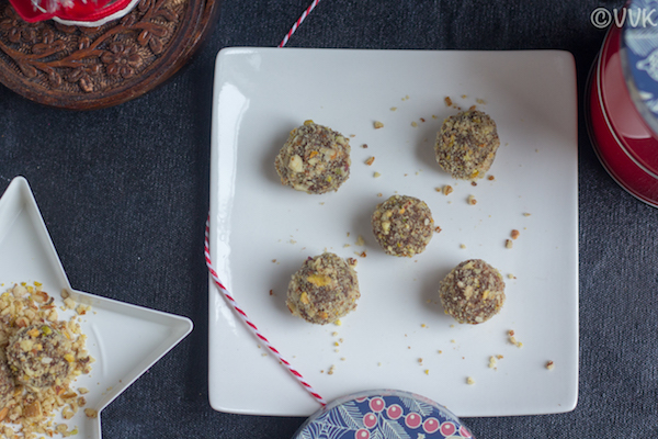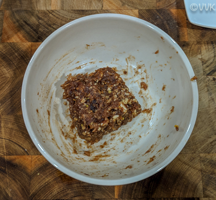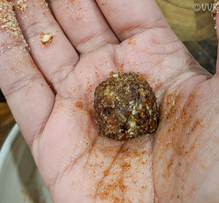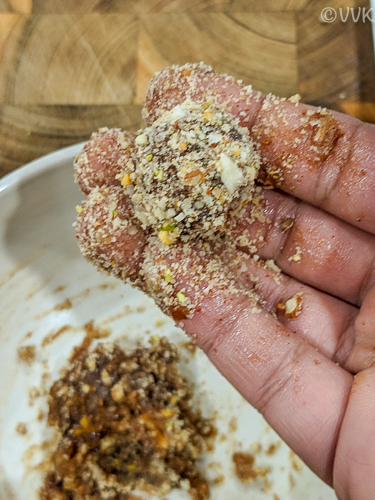 - Roll this ball in the nut mix so that the nuts get evenly coated. Set this aside.