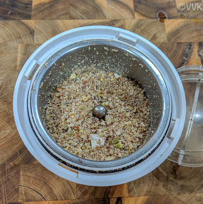 - Pulse them twice or thrice and grind it into a coarse powder. Transfer it into a bowl.
