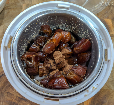 - Now in the same mixer jar, add the chopped dates and the pumpkin pie spice.