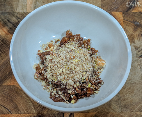 - Transfer it to a bowl and add 2 tbsp of the ground nuts and mix it. Adding nuts makes the ground dates firm and thick.