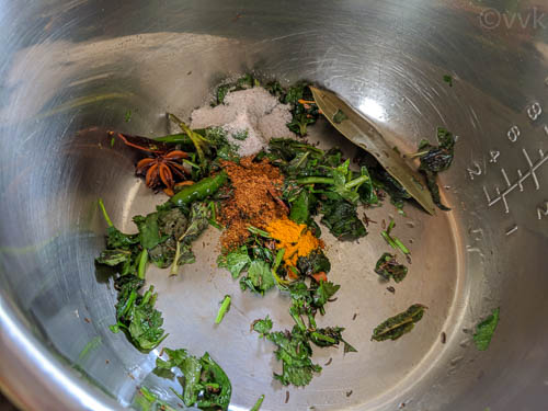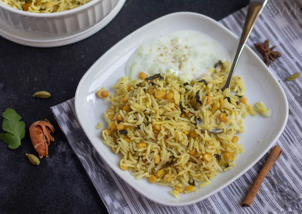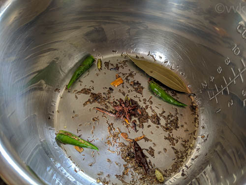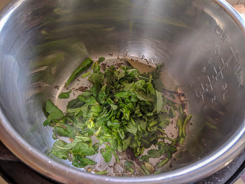 - I made it without onion and garlic, but you can include both. After adding the whole spices and green chilies, you can add 1 cup of chopped onion and 2 tsps of ginger-garlic paste and saute until the onion turns translucent. Then you can add the mint leaves and follow the other steps — no change in cooking time.