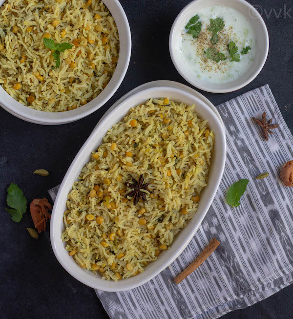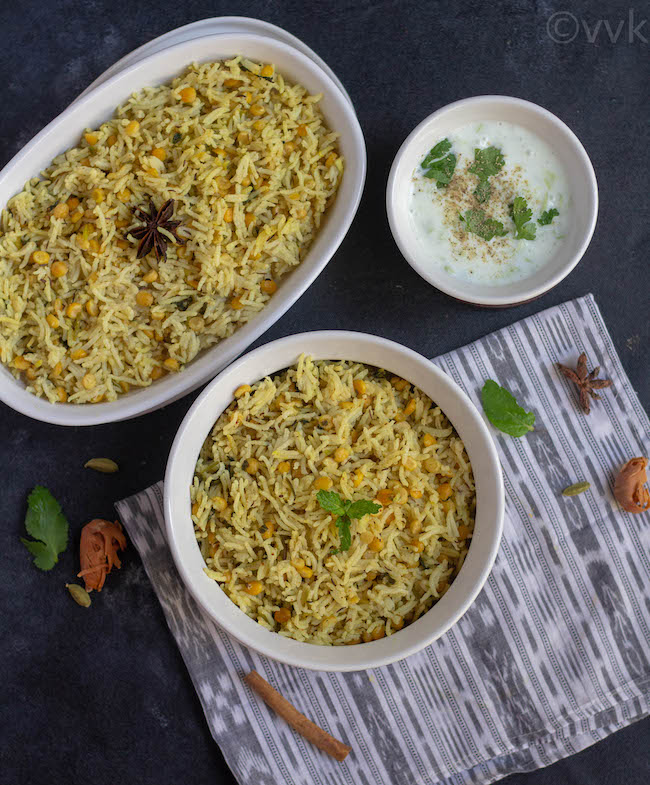 Qubooli biryani is the traditional Hyderabadi veg biryani made with chana dal or the Bengal gram dal. It is mildly spiced and made only with rice and lentils (chana dal), yet it is delicious and exotic. Thanks to the royal spices that add the flavor. We don’t need to add any flavoring agents like kewra water as we did in Hyderabadi biryani. I know, I am repeating this again, but I need to insist again – this qubooli biryani is a simple yet flavorful dish.
