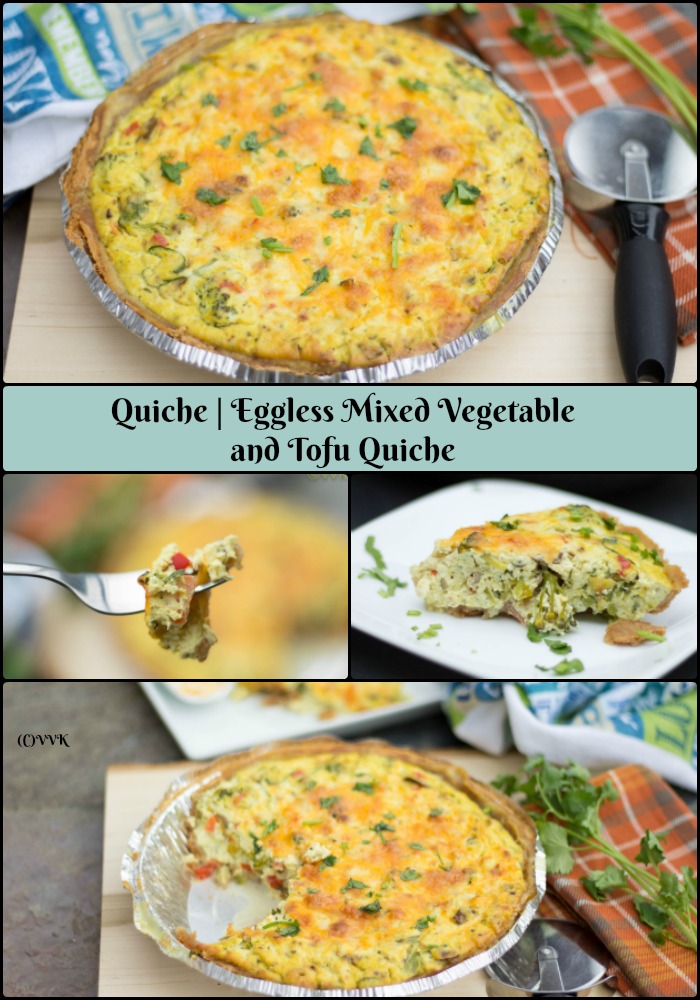 Looking for a protein rich, quick and delicious meal? Then this recipe is for you. Here is the vegetarian version of the French delicacy – Quiche with Tofu and vegetables. When I tried my vegan tofu frittata, I made a note to try a quiche with tofu but completely forgot. Glad I forgot, if not I would struggle for the alphabet Q. :-) So here is the eggless quiche recipe with tofu. Please refer to the notes section for the vegan version.