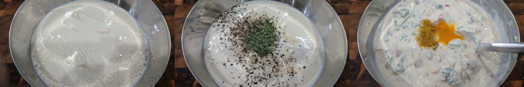 - To the pureed tofu, add the salt, pepper, thyme and veggies. Combine them together and then add the curry powder and turmeric.