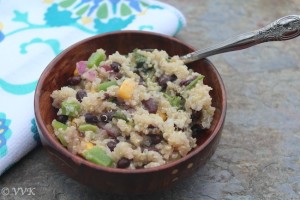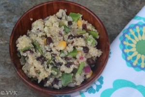 - Add the chopped veggies, black beans, green chilly and corn to quinoa.