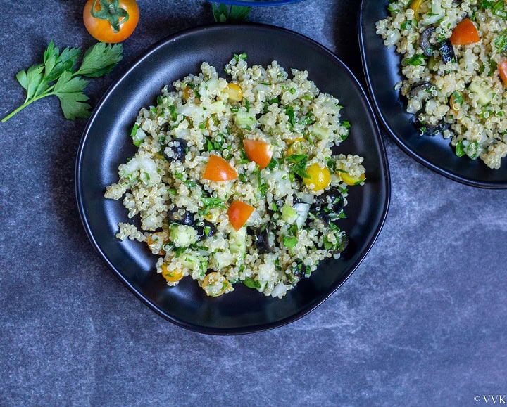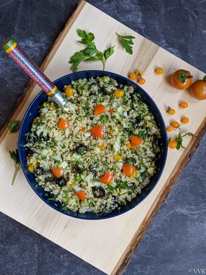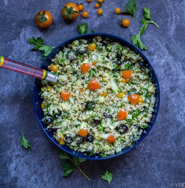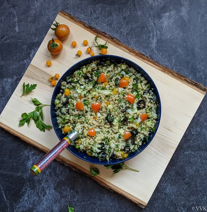 Vegan and gluten-free tabbouleh salad with quinoa – a refreshing summer salad with the flavors of parsley loaded with onions, cherry tomatoes, and olives.