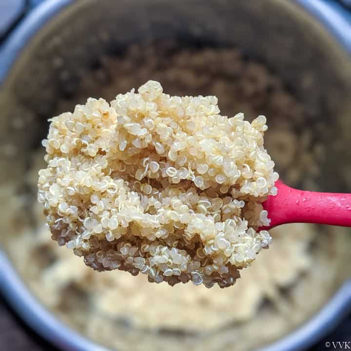 - Pressure cook for 8 minutes and release the pressure naturally. When the pressure is all gone, open the IP lid and fluff the quinoa. Allow it cool completely. Trust me, folks, as the quinoa cools down, it will become fluffy.