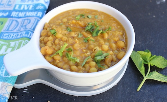 - Mix well and pressure cook for about 4 to 5 whistles. Once the pressure is gone, mash it well and add the cilantro. That’s it. Ragda is ready.