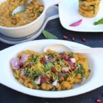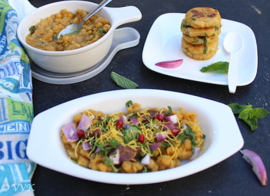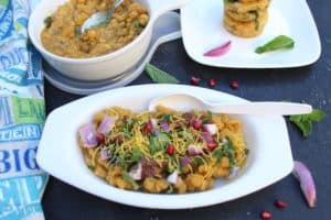 Next, for assembling you need the sweet and green chutney with sev and other condiments like onions, cilantro, and pomegranate seeds. One thing that I’ve noticed with all these chaat recipes is that even though the process sounds super lengthy they are not difficult to prepare. Also, if you plan and do the preparations well ahead, these recipes can be whipped up easily.
