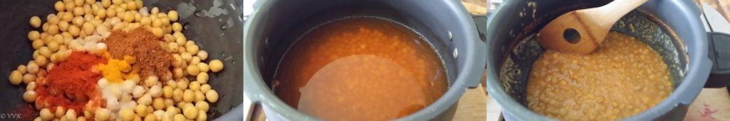 - Add the soaked peas to the pressure pan or cooker. Now add the salt, turmeric powder, garam masala, red chili powder, and water.