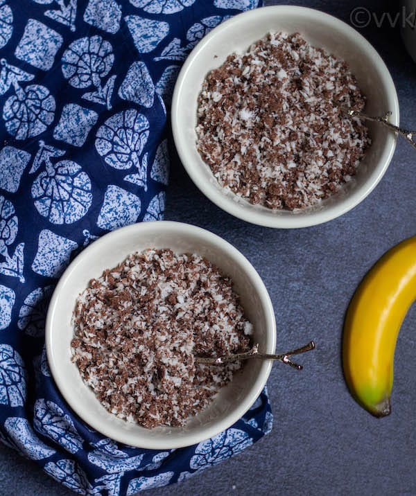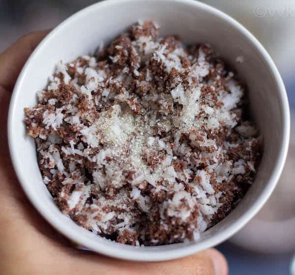 - Coconut Measure – As you can see, my coconut measure is more than ragi flour. Again, it’s our personal choice, especially with ragi flour, we liked it that way. But you can use ⅓ to ½ of grated coconut for this measure.