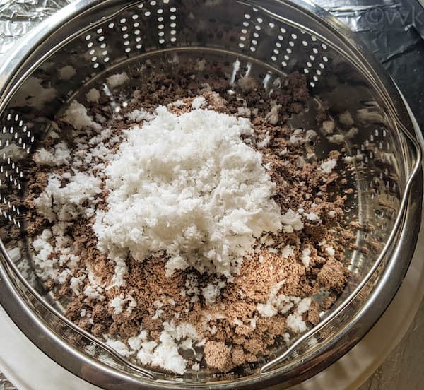 - Next, add the remaining ragi flour, followed by the coconut. Here is my layered puttu mix.