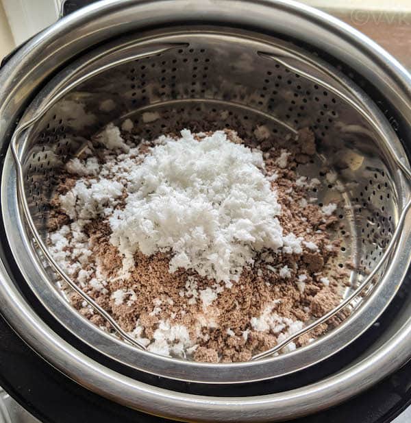 Recently I started to steam puttu in the Instant Pot. Initially, I was doing it in the PIP method and used a bowl (I place the puttu mix inside the bowl and place it on a trivet) inside the inner pot. But I recently started to do it in a steamer basket instead of a vessel.